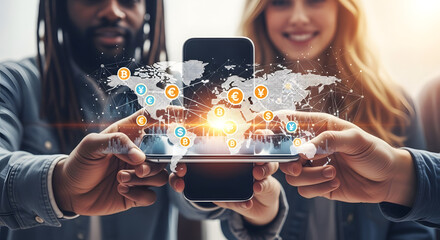 Diverse group collaborating on digital global network project using smartphones and tablet.