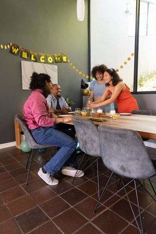Diverse Group Enjoying Celebration Gathering At Home With Welcome Banner Images