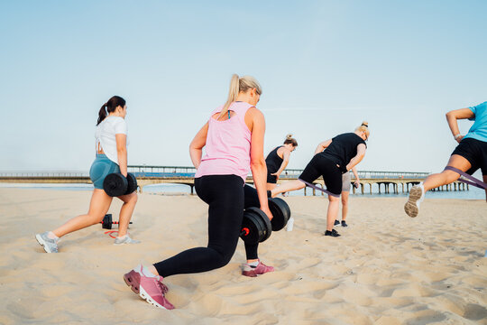 Diverse Group Of Women Exercising With Dumbbells In Fitness Class Images