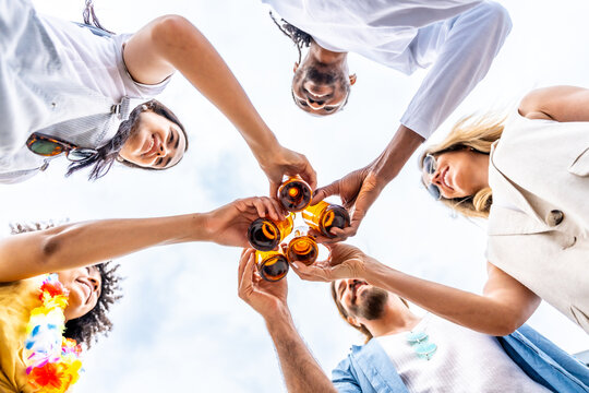 Diverse Group Toasting At Celebration With Drinks From Low Angle Images