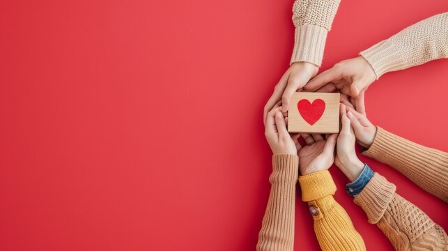 Diverse Hands of Various Ages and Ethnicities Collaborating Around a Heart Icon Central Block in a Bright Red Flat Lay