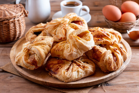 Hand pies. Mini puff pastry or hand pies stuffed with jam and sprinkle sugar powder in wooden plate. Homemade pie snack with crust for breakfast photo.