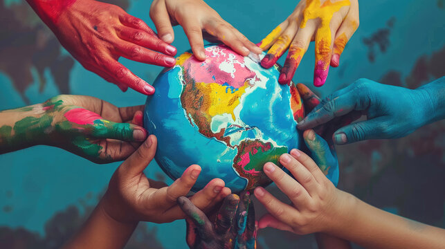 A globe surrounded by interconnected hands of different colors, symbolizing global unity