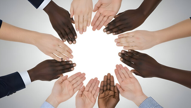 close-up photo of diverse hands joined together, symbolizing unity and inclusivity, multiracial friendship