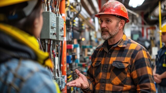 Teacher guiding students in school hallway