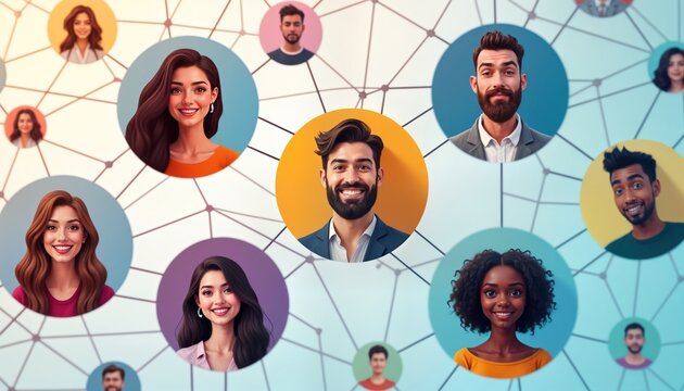 Diverse group of people connected in network graphic. Smiling faces represent social media community. Modern graphic design represents online interaction, engagement. Graphic digital communication,
