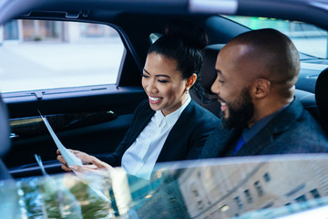Smiling woman texting in back seat of car with chat overlay and urban window view