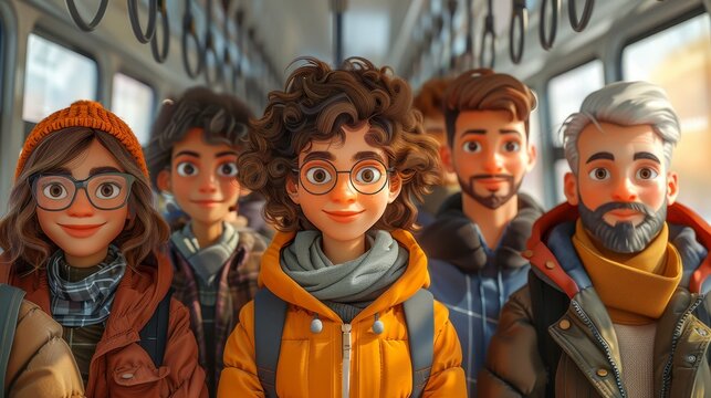 Diverse Passengers Aboard Brightly Lit Subway Train with Vibrant Advertisements