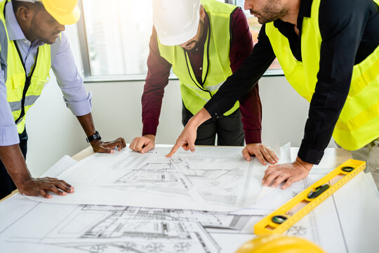Team of Engineers diverse in safety suite discussing draft blueprints and on the desk at the workplace, architectural projects, Developer real estate, teamwork, architecture, and construction concept.