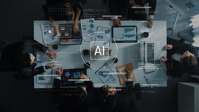 A diverse group of business professionals engaged in a collaborative meeting, analyzing data and strategies using modern technology and innovative tools. Raster