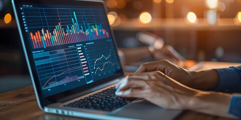 A closeup of a persons hand analyzing financial data on a laptop screen with various graphs and charts. Concept Finance, Data Analysis, Technology, Closeup Shot, Business Concept