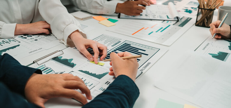 Financial strategy, growth analysis and planning in meeting with laptop, tablet and graph charts in office. Above desk of diverse group business people analyzing marketing data, report and profit