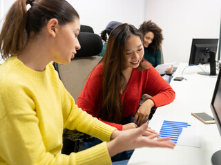 Positive multiracial women in casual clothes sitting at table with computer and discussing chart with results of marketing research  on paper while working together in modern coworking office