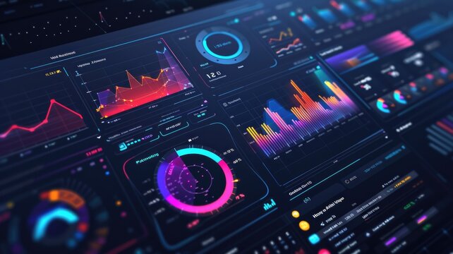 digital dashboard showcasing various interactive data analytics, including graphs, charts, and performance metrics.