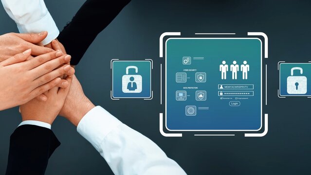 Diverse Business Team Collaborating on Cybersecurity Strategies with Digital Interface Elements for Data Protection and Online Security Awareness Gluon.
