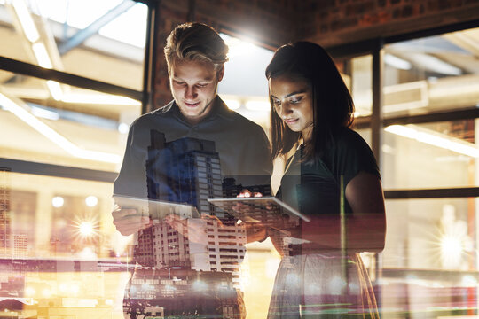We make connecting with the business world easier for you. Shot of two young businesspeople using their digital tablets in their office at work.