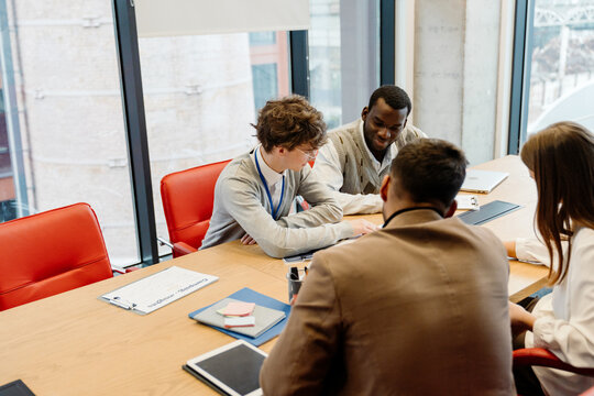 Candid shot of diverse business team working together during meeting in modern office discussing documents and analyzing data