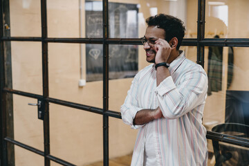 Positive Hispanic man standing by glass wall and touching eyeglasses in office