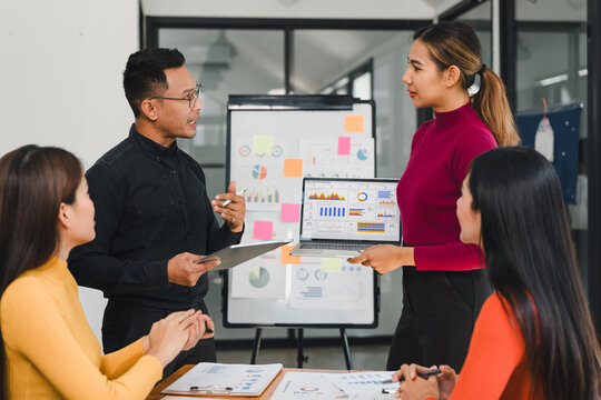 Professional Asian and multicultural team discussing performance metrics during formal meeting in office with digital marketing analytics on large screen.
