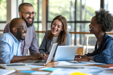 A diverse group of businesspeople were working together in an office, smiling and discussing over a laptop computer on a table