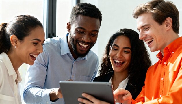 Excited diverse colleagues brainstorm ideas together using a tablet in a vibrant office, fostering collaboration and innovation for a successful business