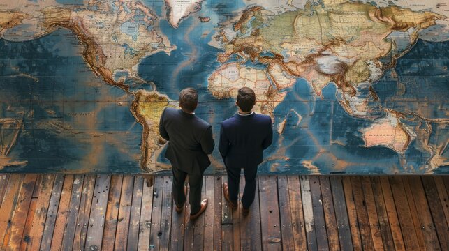 Team of diverse partners sitting at table mature Latin business man and European business woman discussing project on laptop in office. Two colleagues of professional business people working together.