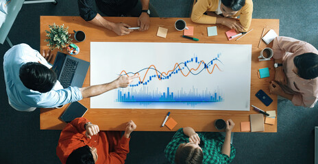A diverse team collaborates in a modern office setting, analyzing data and strategizing. Overhead view showcases teamwork with technology and digital tools. Trope