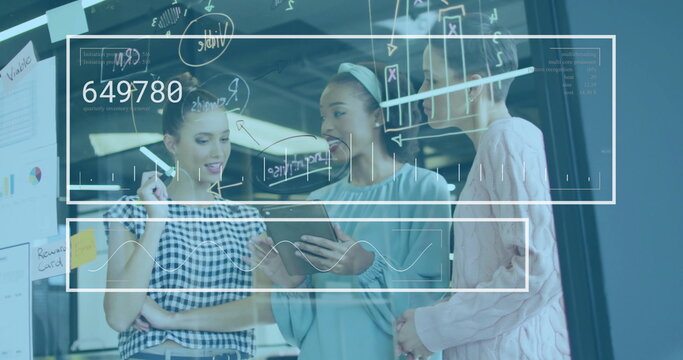 Image of statistical data processing over three diverse women discussing over a laptop at office