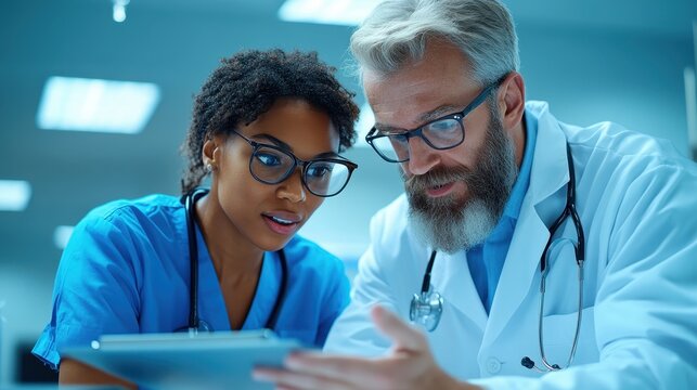 Middle aged Caucasian man with gray hair sitting at desk using tablet computer alongside young Black man and other medical professionals, working in modern clinical setting