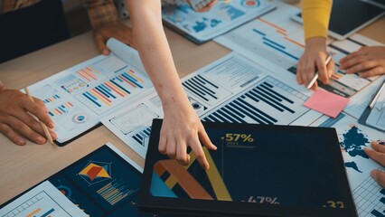 A top view of a diverse business team engaged in collaborative analysis, utilizing digital tools and charts to discuss performance metrics and strategic direction. Trope