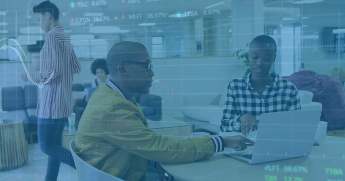 Image of data processing and diagrams over diverse business people discussing work in office