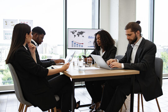 Diverse group of business professionals engaged in analyzing data and collaborating in modern well-lit office. Team using laptops and digital devices for work with charts and graphs on screen.