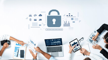 Diverse professionals engage in cybersecurity discussions using digital devices and charts, illustrating modern teamwork in a secure business environment. Trope