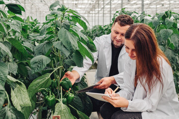 Experienced scientists are analyzing various plants in a controlled greenhouse laboratory. Growing organic vegetables in a modern greenhouse, food industry. Hydroponic farming