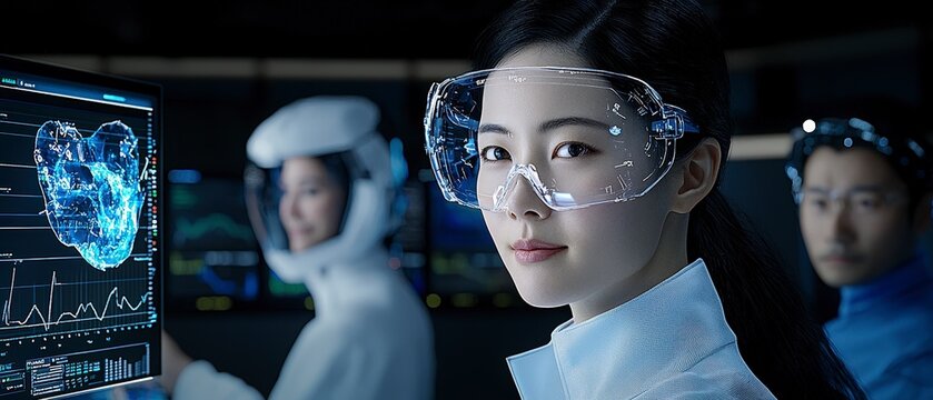Scientists collaborating in advanced laboratory with tech overlay