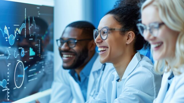 A group of diverse professionals in lab coats smiles while viewing digital data on a screen, showcasing collaboration and innovation in a high-tech environment.