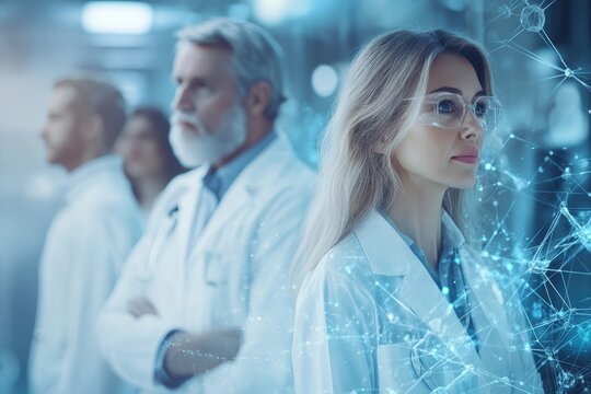 Diverse scientists collaborating in high-tech laboratory with digital network overlay