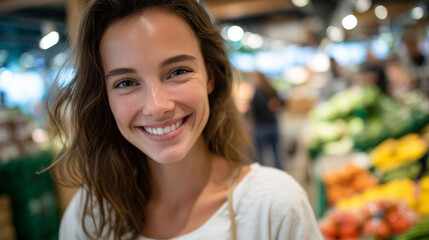 Medium shot of woman carrying grocery bag, smiling, surrounded by busy supermarket aisle with colorful packaging and fresh produce, natural interactions of shoppers in soft focus