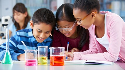 A group of diverse kids in a science classroom, enthusiastically conducting an experiment with test tubes and a microscope. The scene captures curiosity, education, and teamwork.