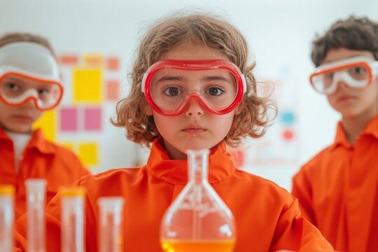 Vibrant STEM Classroom Diverse Kids Engaged in Science Experiment with Beakers and Goggles - Modern Educational Tools for Interactive Learning and Collaborative Innovation