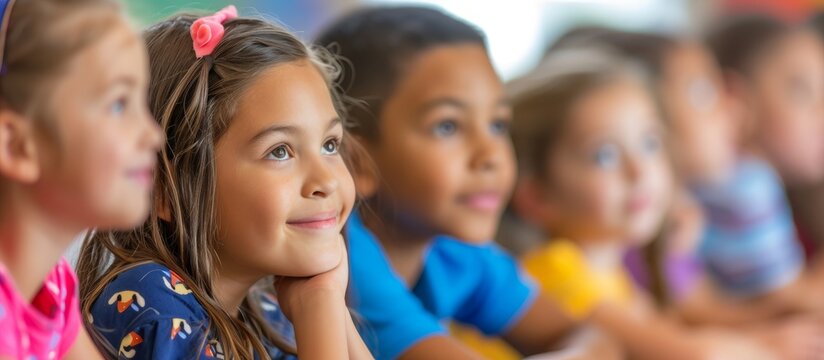 Diverse group of happy, curious and engaged children sitting in a colorful and vibrant classroom environment, learning and interacting