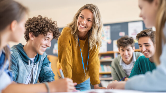 Engaging teacher interacting with students in classroom setting, fostering collaboration and learning. atmosphere is positive and supportive, encouraging student participation and teamwork