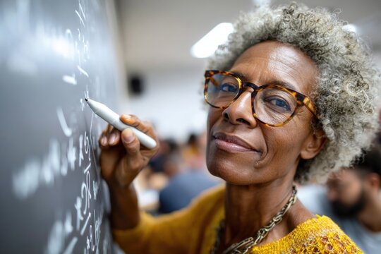 A teacher stands before a chalkboard filled with math equations, explaining concepts to a diverse group of attentive students seated at their desks