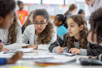 Diverse Group of Students Collaborating on Math Problems in Classroom Setting