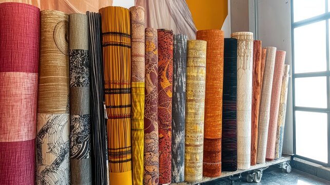 A vibrant display of various colorful fabric rolls stacked in a shop, showcasing diverse textures and patterns.