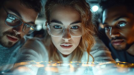 Innovative team analyzing data on digital interface, showcasing collaboration and technology. individuals display focus and determination while interpreting complex information