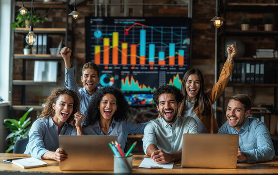 Diverse team analyzing data growth in modern office