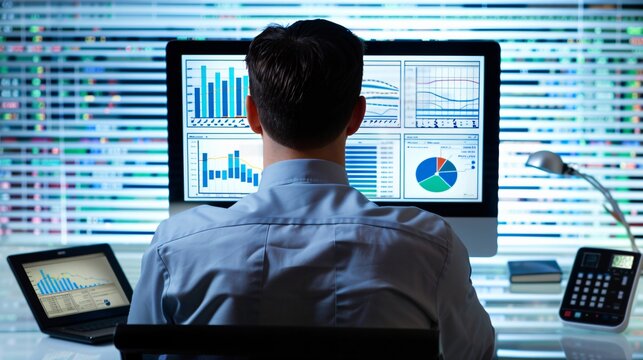 An investor analyzing data on a desktop computer, with graphs and figures on the screen, viewed from behind