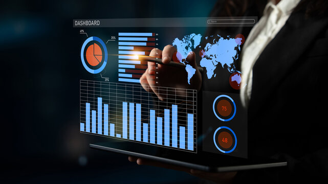 A business professional engages with an interactive data dashboard featuring various graphs and charts, highlighting key insights for strategic decision-making. Impute