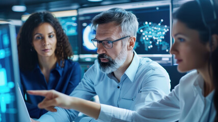 A team of professionals collaborating in a high-tech office, analyzing data and developing strategic solutions using advanced digital technology, teamwork and innovation